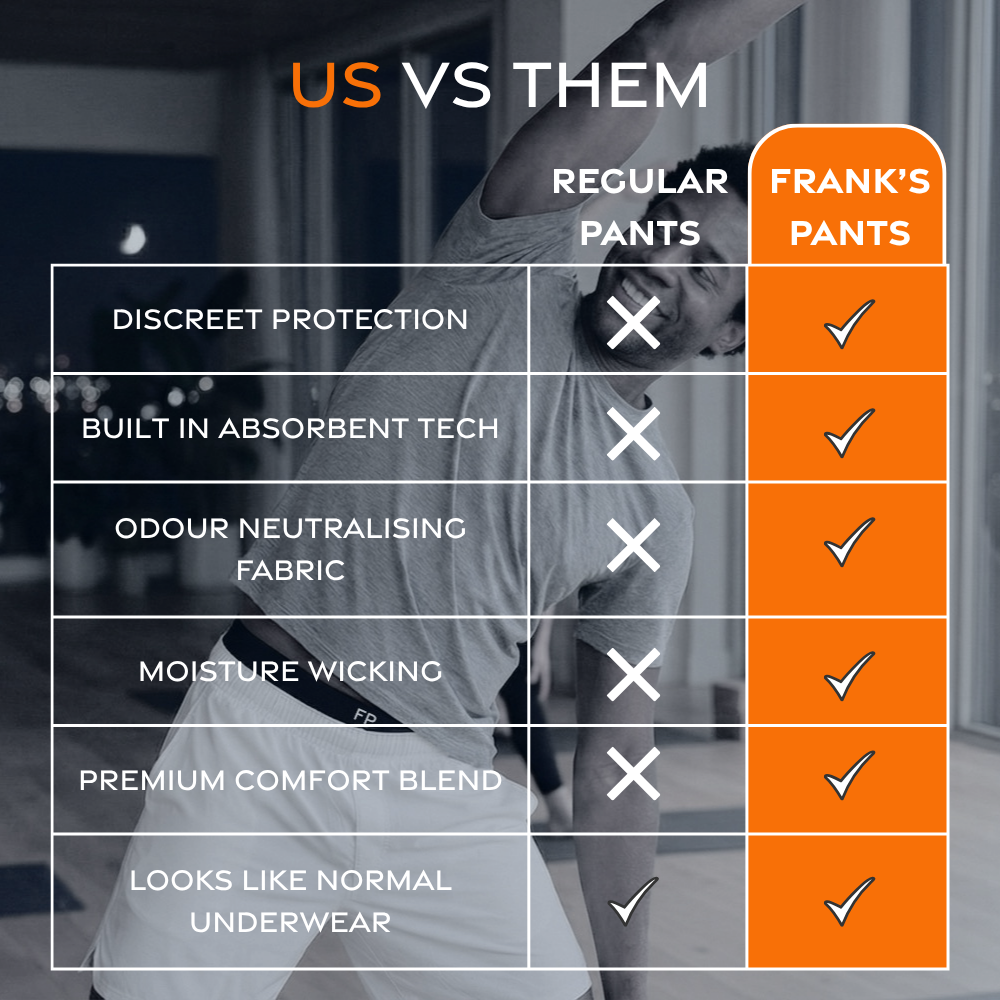 Made for men who experience small day to day leaks such as dribbles after the loo, the dot after a workout or those unpredictable moments that interrupt your flow. Whether you are active, on the go or simply want underwear that quietly has your back, Frank’s Pants gives support without stigma and comfort without compromise.
